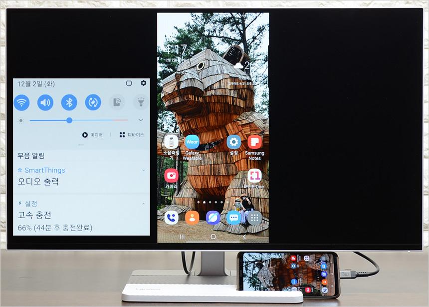 미러링 지원 스마트폰과 연결해 스마트폰 영상을 대화면으로 즐길 수 있으며 전력도 공급되어 스마트폰 충전용으로 유용하게 활용할 수 있다. (고속충전 지원으로 충전시간이 상당히 짧은 것을 확인할 수 있었다.)
