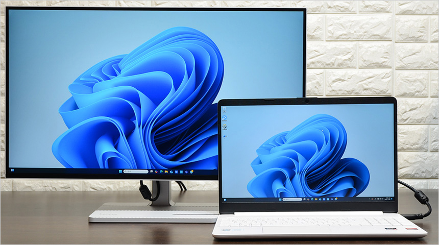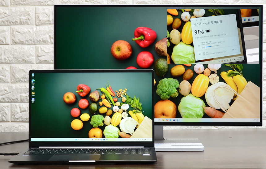 HDMI 단자를 지원해 시중에 판매되고 있는 대부분의 노트북과 편하게 연결할 수 있다. 집이나 사무실 등에서 노트북을 메인으로 사용할 경우 사진과 같이 모니터를 연결해 주면 효율적인 멀티테스킹이 가능하다.