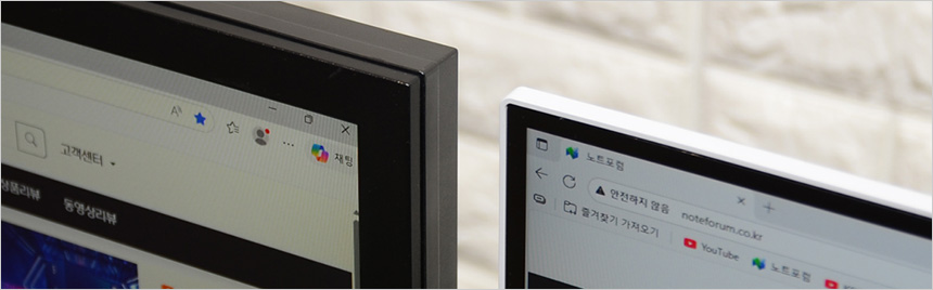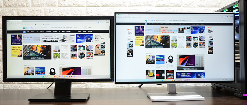 두 대의 모니터를 셋팅한 김에 패널과 베젤 두께를 비교한 모습으로 확연한 차이를 보여주었다. 이 제품은 슬림 베젤을 적용해 높은 몰입감을 경험할 수 있으며 듀얼 모니터를 구성할 때 베젤로 인한 거슬림을 최소화 할 수 있다.