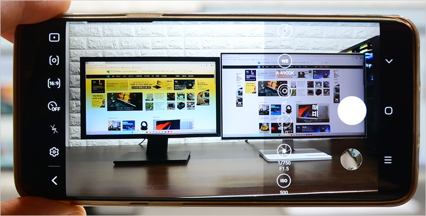 모니터에 깜빡임이 발생하면 눈의 피로감이 가중될 수밖에 없다. 상단의 사진은 모니터 깜빡임 (플리커) 여부를 확인하기 위해 플리커 현상이 발생하는 구형 모니터와 비교 테스트를 진행하고 있는 모습으로 눈으로 볼때는 차이가 없었지만 스마트폰 카메라로 확인했을 때 에는 (전문가 모드에서 셔터스피드 1/300 이상으로 셋팅) 확연한 차이가 발생하는 것을 확인할 수 있었다. @ 동영상을 통해 자세히 확인하기 바란다.