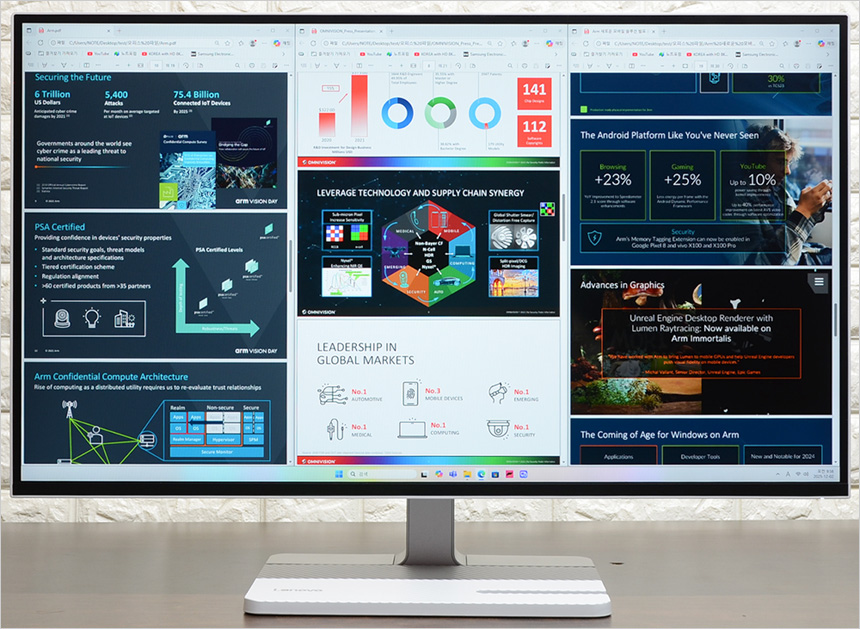보급형 모델들과 확연히 비교되는 세련된 디자인과 슬림 베젤을 적용해 탁 트인 시야감을 제공하는 것이 인상적이었다. 리뷰를 통해 디자인과 특징을 자세히 살펴보고 다양한 테스트를 통해 화질과 성능, 지원 기능을 확인해 보도록 하자.