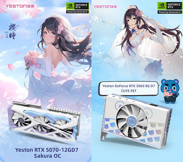 한국 시장에 처음 선보이는 Yeston 그래픽카드는 NVIDIA GeForce RTX 50 시리즈 GPU를 기반으로 한 서브컬쳐 콘셉트 제품군으로, ▲Yeston Sakura Atlantis GeForce RTX 5080, ▲Yeston Sakura GeForce RTX 5080, ▲Yeston Sakura GeForce RTX 5070, ▲Yeston Cute Pet GeForce RTX 5060 등 총 4종으로 구성된다.