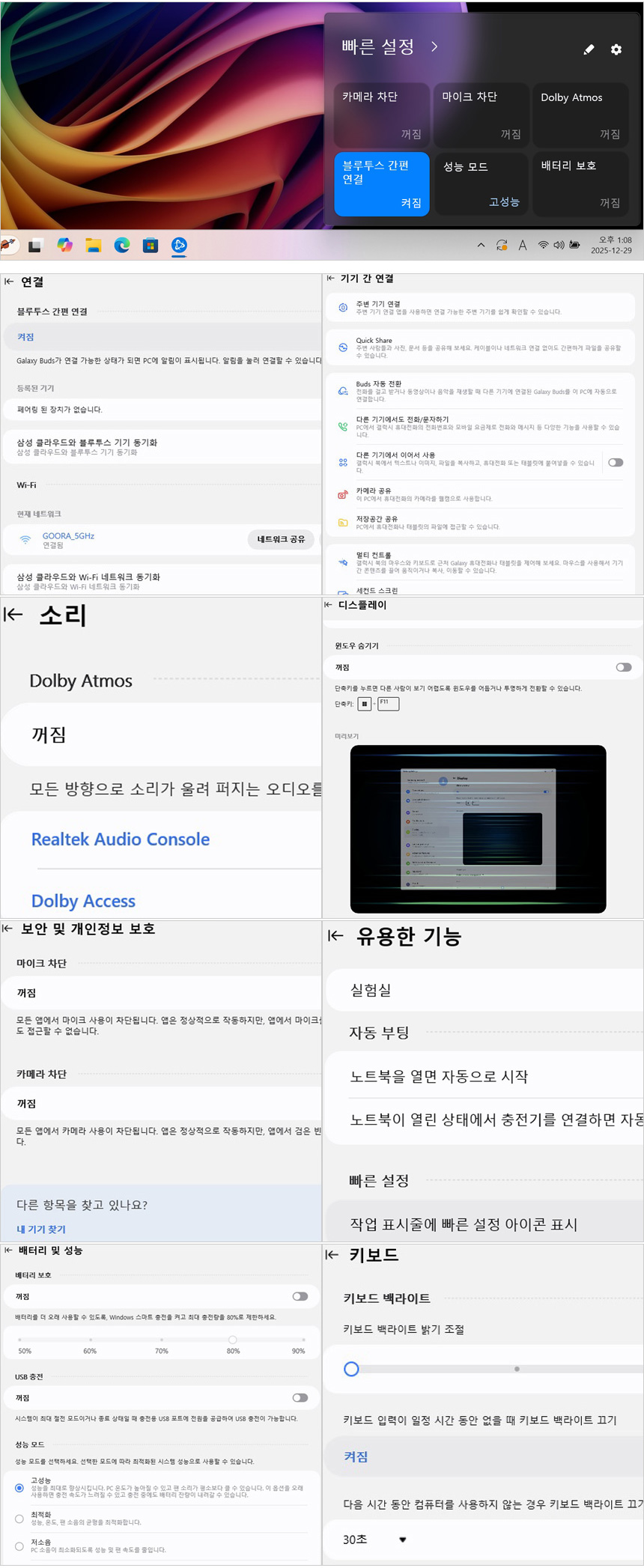삼성 Settings를 실행한 모습으로 (Fn+F1 단축키 제공) 빠른 설정을 지원해 편의성을 높였으며 메인 메뉴에서는 블루투스 연결과 사운드 & 디스플레이 설정이 가능하다. (디스플레이 메뉴에서 사생활 침해를 방지할 수 있는 윈도우 숨기기 기능이 추가되었다.) 또한 퍼포먼스 설정과 키보드 백라이트 설정 등을 지원한다. (자세한 사항은 동영상을 참조하기 바란다.)