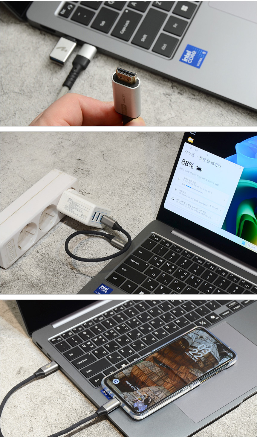 2개의 썬더볼트 4 단자를 지원해 활용성을 높인점도 칭찬하고 싶다. 빠른 데이터 전송은 물론 디스플레이 출력을 지원해 멀티 모니터 연결이 가능하며 PD충전 지원으로 어디서나 편하게 전원을 공급할 수 있었다. 뿐만 아니라 상시전원 지원으로 강의실 등에서 스마트폰 충전용으로도 활용할 수 있다.