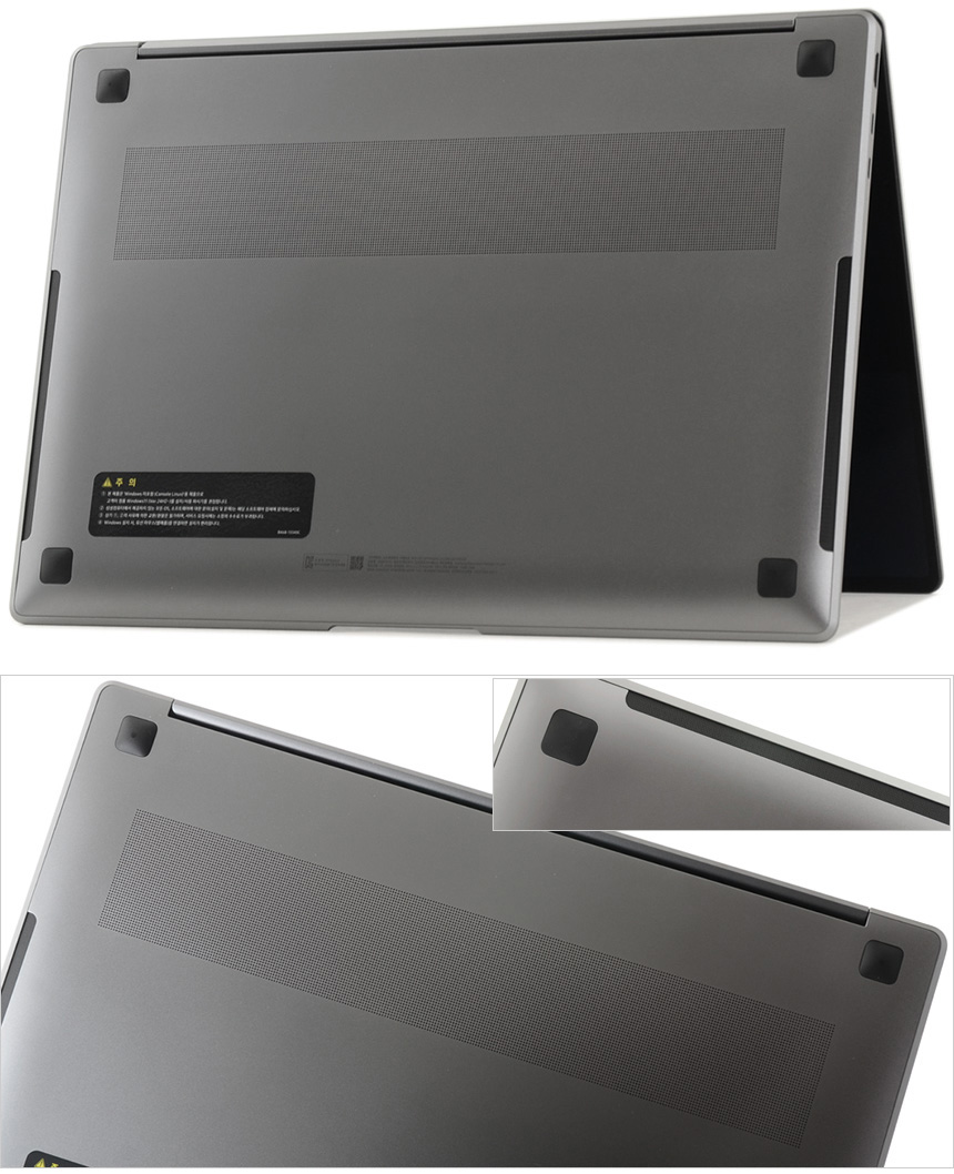노트북 바닥면의 모습으로 사방에 고무패드가 부착되어 미끄러짐을 방지하며 칩셋과 팬이 설치된 상단부에는 효율성을 높이기 위해 통풍구가 설치된 것을 확인할 수 있다. 또한 하단에는 영화나 스포츠 감상시 더 깊고 선명한 사운드를 즐길 수 있도록 돌비 애트모스를 지원하는 쿼드 스피커 (우퍼 5W x 2, 트위터 3.3W x 2) 를 탑재해 일반 노트북을 압도하는 시원한 사운드를 즐길 수 있다. 전작대비 2배 커진 38mm 대형 우퍼를 탑재해 깊고 풍부한 베이스를 즐길 수 있다.