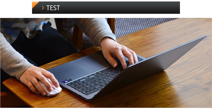 타이핑 테스트를 진행하고 있는 모습으로 구분감이 확연해 눈으로 확인하지 않고도 원할한 타이핑이 가능했다. 뿐만 아니라 넓은 팜래스트 지원으로 손 뿐만 아니라 손목까지 안정적으로 받쳐놓은 상태에서 편하게 노트북을 사용할 수 있었으며 키간격이 넓어 오타없는 고속 타이핑이 가능했다.