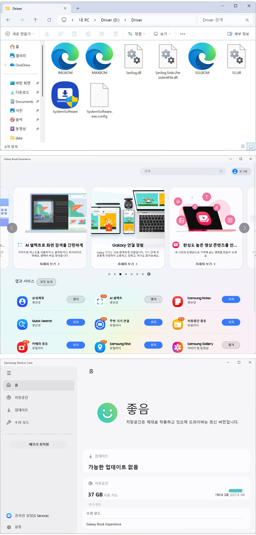 윈도우와 드라이버 설치 후 삼성 디바이스 케어를 설치해 (MS 스토어에서 지원) 드라이버를 최신으로 업데이트 해 주고 갤럭시북 익스피리언스로 이동해 삼성에서 제공하는 다양한 앱을 설치해 주면 노트북 셋팅을 완료할 수 있다.