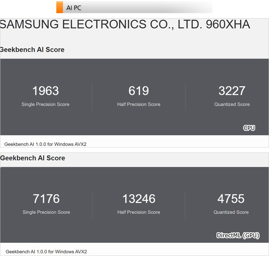 AI 전용 벤치마크 툴을 이용해 AI 성능 테스트를 진행하고 있는 모습으로 생성형 AI도 부드럽게 사용할 수 있는 높은 스코어를 보여주었다. (팬티엄 등의 CPU를 탑재한 모델들과는 확연히 다른 성능을 제공한다.)