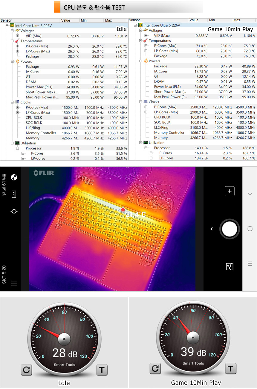 CPU 온도 테스트를 진행하고 있는 모습으로 (최고 성능 모드, 실내온도 13도) 아무것도 하지 않은 Idle 상태에서는 20도 후반대로 동작했으며 10분간 게임을 실행하고 측정했을 때 70도 초반까지 온도가 올라가는 것을 확인할 수 있었다. (온도걱정 할 필요없이 사용할 수 있는 노트북이다.) 또한 열화상 카메라를 이용해 게임 실행중 열분포를 확인해 보았는데 상단중앙을 중심으로 열이 퍼져나가며 팬이 설치된 양측면은 온도가 낮은 것을 확인할 수 있다.