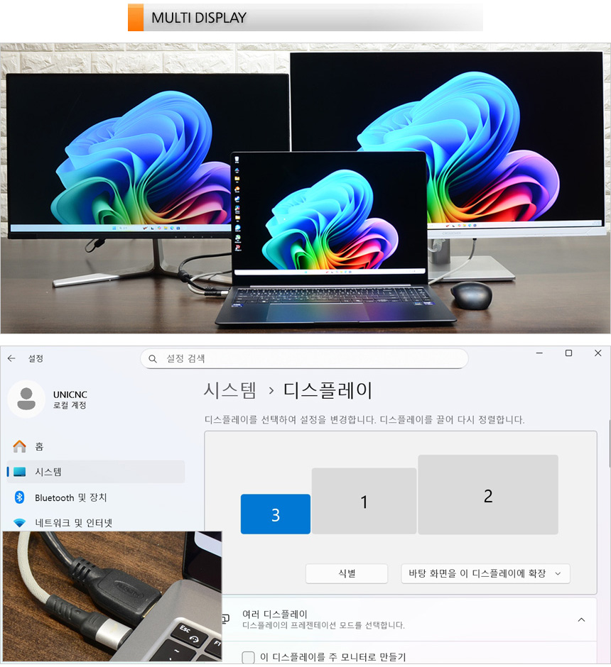 썬더볼트 4 단자가 디스플레이 출력을 지원해 HDMI를 포함한 2개의 모니터를 추가할 수 있다. 상단의 사진은 멀티 디스플레이 테스트를 진행하고 있는 모습으로 원활하게 작동하는 것을 확인할 수 있었다. @ 최대 모니터 개수가 4개인 에로우레이크와 달리 루나레이크는 3개의 최대 모니터를 지원한다. 이점 참조 바란다.