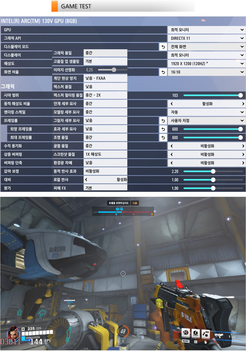 디아블로 4를 WUXGA 해상도에서 중간 옵션으로 실행하고 있는 모습으로 인텔 XeSS (고성능) 기술을 활성화 했을 때 91-112 프레임을 보여주어 부드럽게 게임을 즐길 수 있었다. 충분히 게이밍 용도로 활용할 수 있을 것이다. (프레임 생성 기능이 활성화 되어 예전대비 프레임이 높아졌다.)