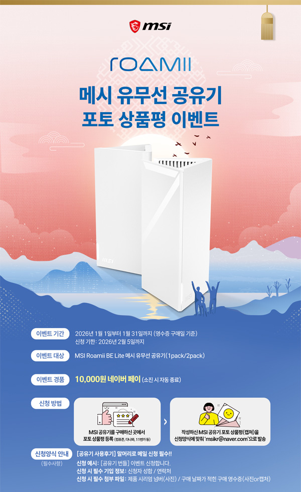 이번 이벤트는 2026년 1월 1일부터 1월 31일까지 MSI Roamii BE Lite WiFi 7 메시 유무선 공유기를 구매한 고객 중, 제품 사용 후기를 작성한 고객이라면 누구나 참여할 수 있다. 참여 고객에게는 네이버페이 1만 원이 선착순으로 증정되며, 이벤트 신청은 2026년 2월 5일까지 가능하다.