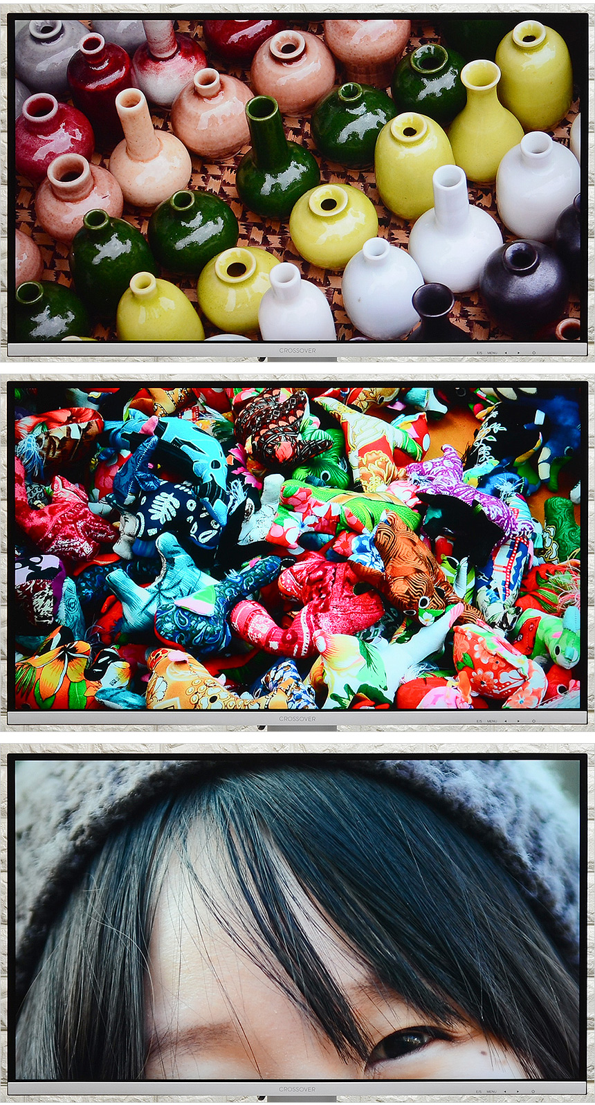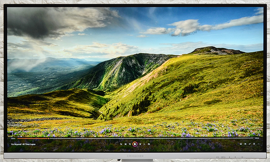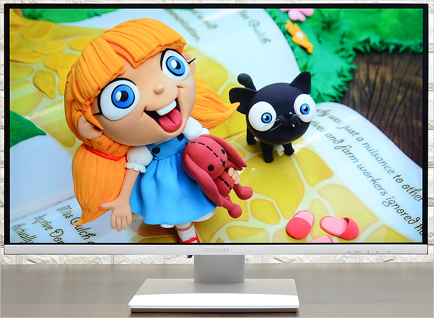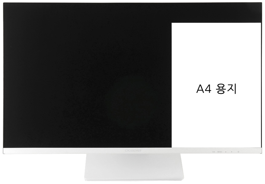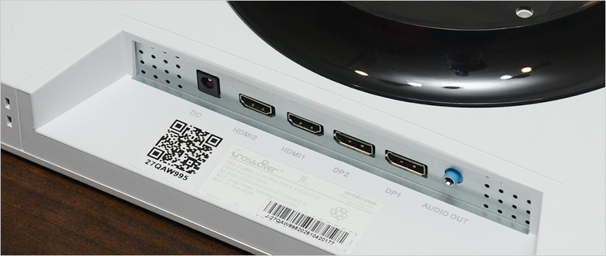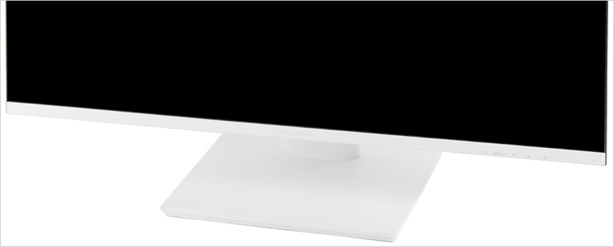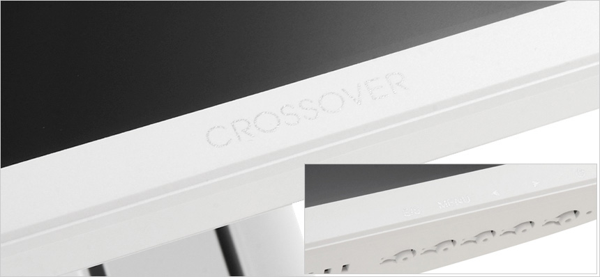 모니터 하단부의 모습으로 크로스오버 문구가 세겨져 있으며 측면에는 모니터 컨트롤을 위한 OSD 버튼 (전원버튼 포함) 이 설치된 것을 확인할 수 있다. (상태표시 LED도 지원한다.) 참고로 이 제품은 장시간 게임을 즐기거나 작업을 하는 유저들의 눈건강을 고려한 아이케어 모니터로 플리커 프리 기술을 지원해 화면 깜빡임으로 인한 눈의 피로를 줄였으며 블루라이트 감소 기능도 제공해 시력저하 등의 원인이 되는 청색광으로부터 눈을 보호할 수 있다.