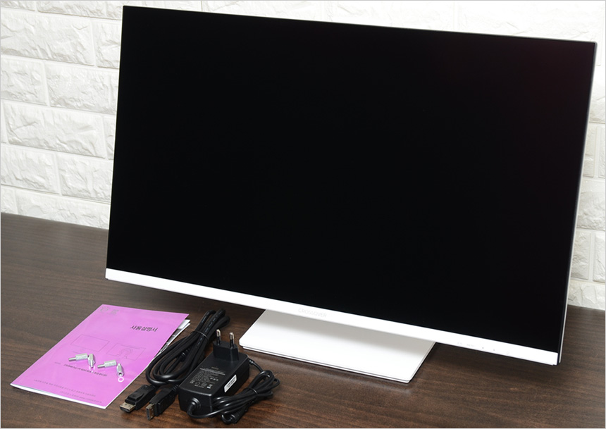 풀KIT 의 모습으로 모니터를 비롯해 케이블 일체형 전원 어댑터와 DP 케이블, 사용설명서, 베사 연장볼트가 제공되는 것을 확인할 수 있다.
