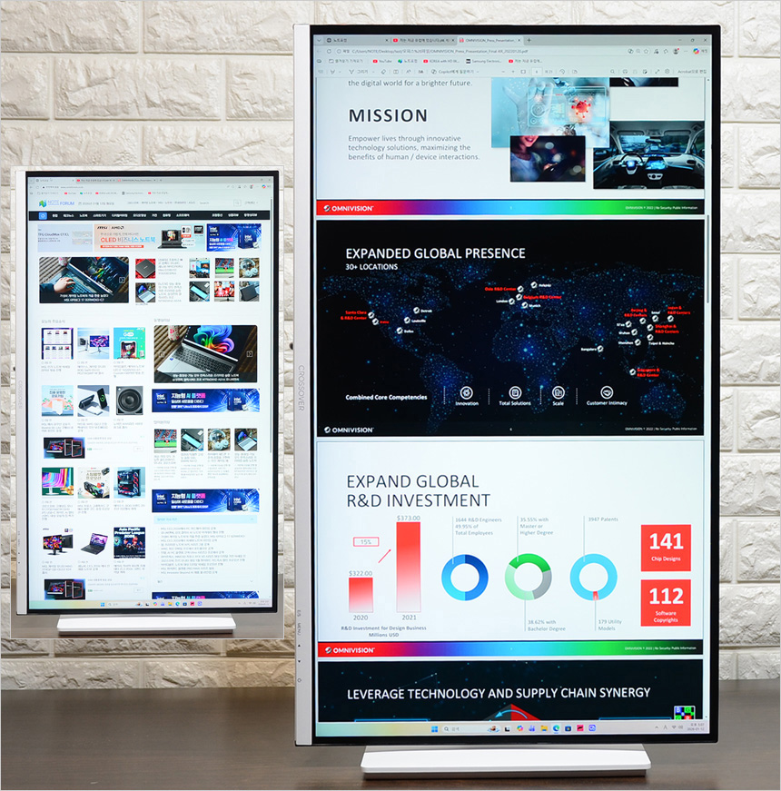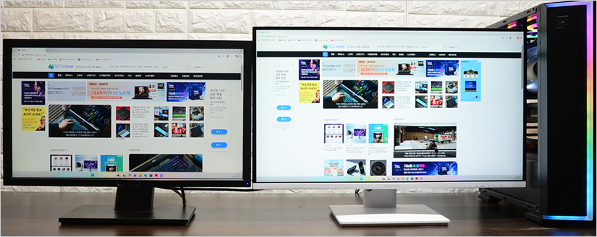 멀티스탠드 탑재를 칭찬하고 싶다. 각도 조절에 한계가 있는 일반 모니터와 달리 화면의 위치나 각도를 마음대로 조정할 수 있을 뿐만 아니라 피벗을 지원해 글을 더 편하게 읽을 수 있을 뿐만 아니라 스마트폰에서 즐기는 세로영상을 풀화면으로 감상할 수 있었다.
