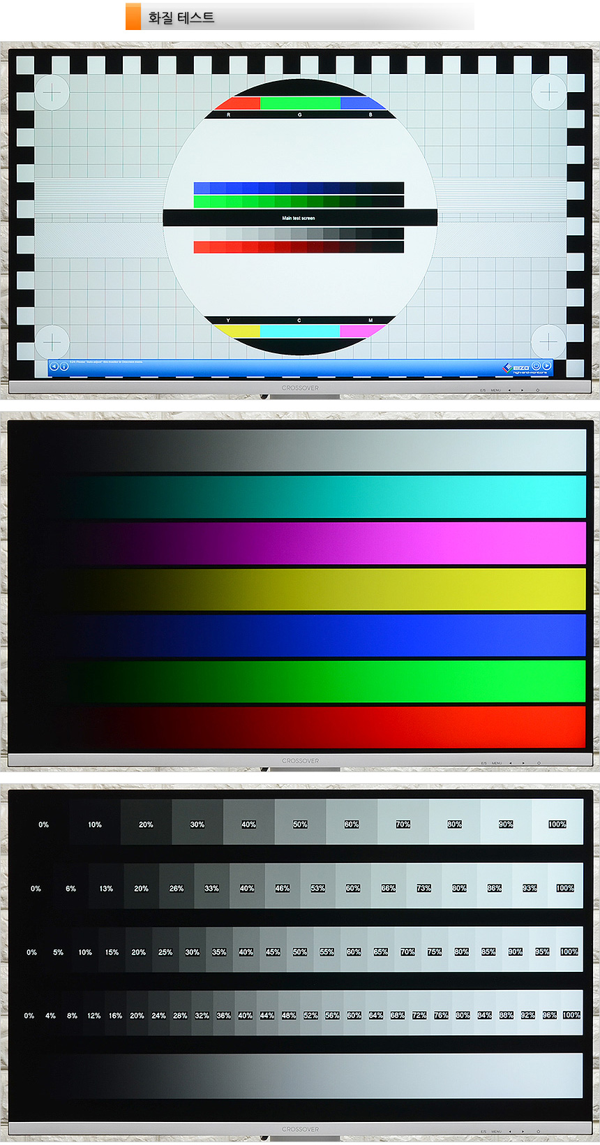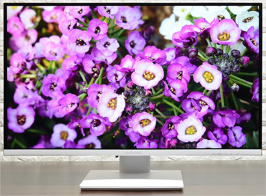 테스트 프로그램을 이용해 화질을 확인하고 있는 모습으로 IPS 패널 특유의 진한 색표현이 인상적이었으며 특정 원색 (레드) 이 튀는 느낌을 주는 구형 IPS 패널과 달리 원색이 지나치게 강렬하지 않아 눈이 편했다. 게이밍에 특화된 모니터 지만 화질이 상당히 뛰어나기 때문에 심플한 디자인 작업도 편하게 실행할 수 있다. 또한 대부분의 IPS 패널 모니터와 같이 1,000 :1 의 명암비를 지원해 상단의 그레이스케일 차트는 충분히 구분할 수 있었다.
