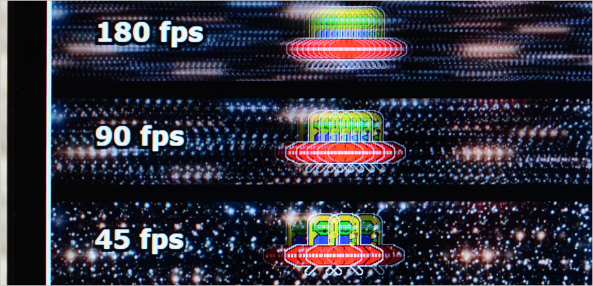 상단의 사진은 180Hz 의 높은 주사율을 쉽게 확인할 수 있도록 하위 프레임과 같이 재생되는 영상 (960 Pixel Per Sec) 을 셔터스피드 1/20 로 촬영한 모습으로 프레임이 낮을수록 캐릭터의 수가 적으며 프레임이 높아질수록 시간당 많은 화면이 뿌려지기 때문에 캐릭터의 수가 많은 것을 확인할 수 있다. 직접 눈으로 영상을 볼 경우 180Hz 의 경우 훨씬 자연스럽게 UFO 가 이동한다.
