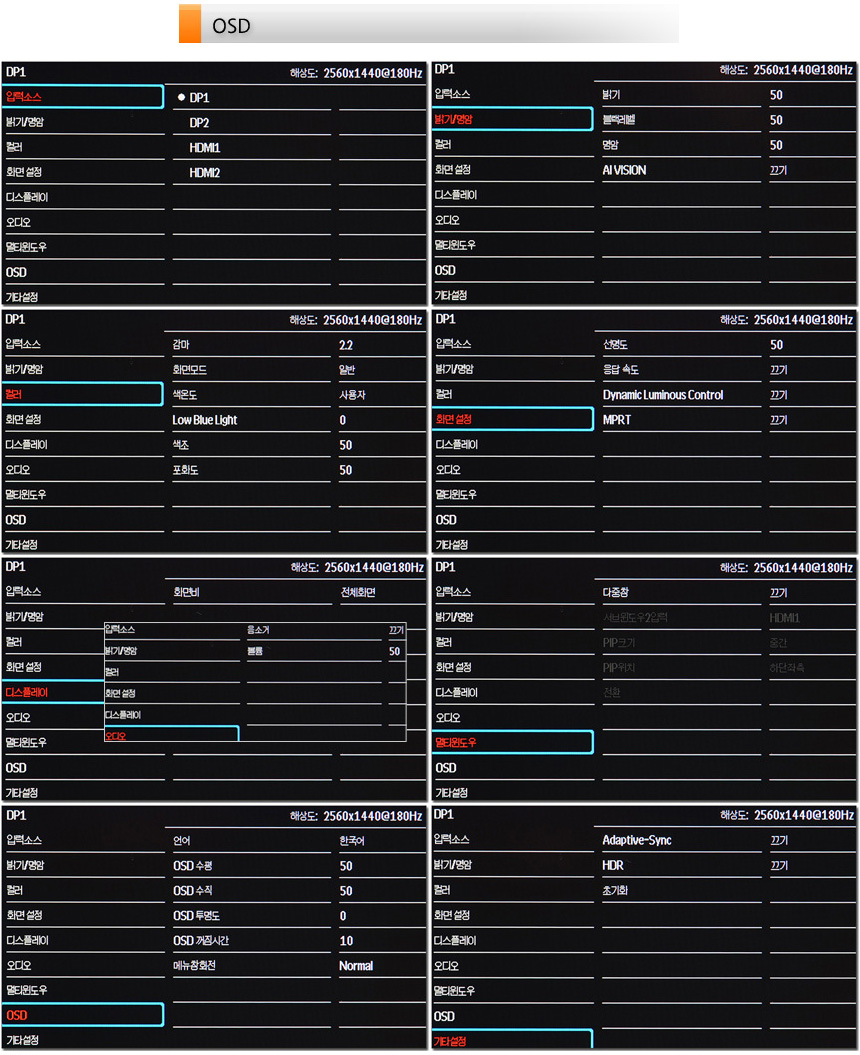 OSD를 지원해 모니터의 다양한 기능을 사용자 임의대로 조정할 수 있다. 특히 입력소스나 볼륨조정, 조준선 등은 핫키로 지원해 편하게 설정을 변경할 수 있다. 상단의 사진은 OSD 상세설정의 모습으로 밝기와 명암 설정을 비롯해 컬러 및 화면모드 설정이 제공된다. 또한 색온도와 어댑티브 싱크, HDR 등은 물론 PBP와 PIP 설정을 위한 멀티윈도우를 지원한다.