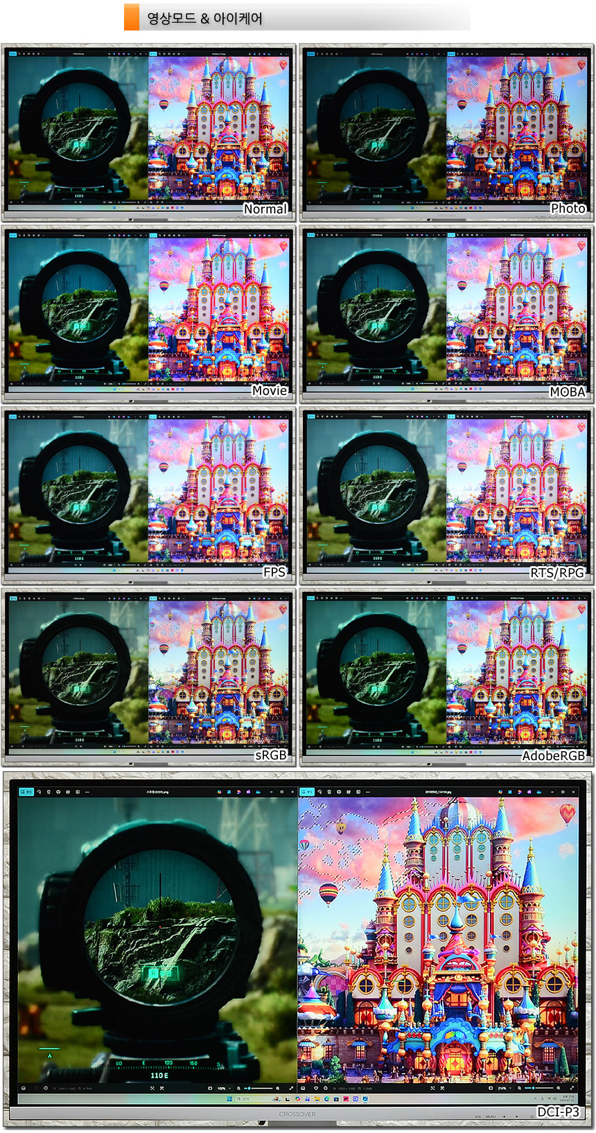 화면모드를 비교한 모습으로 밝기와 명암등에서 차이가 발생하는 것을 확인할 수 있었다. 평소에서는 일반 모드를 사용하다가 작업이나 게임을 할 경우 그에 맞는 모드로 변경해 컨텐츠에 맞는 최상의 영상을 즐길 수 있다. (게임관련 모드만을 지원하는 일반 게이밍 모니터와 달리 작업용으로 사용할 수 있도록 DCI-P3 나 Adobe RGB 등의 모드를 지원한다.)