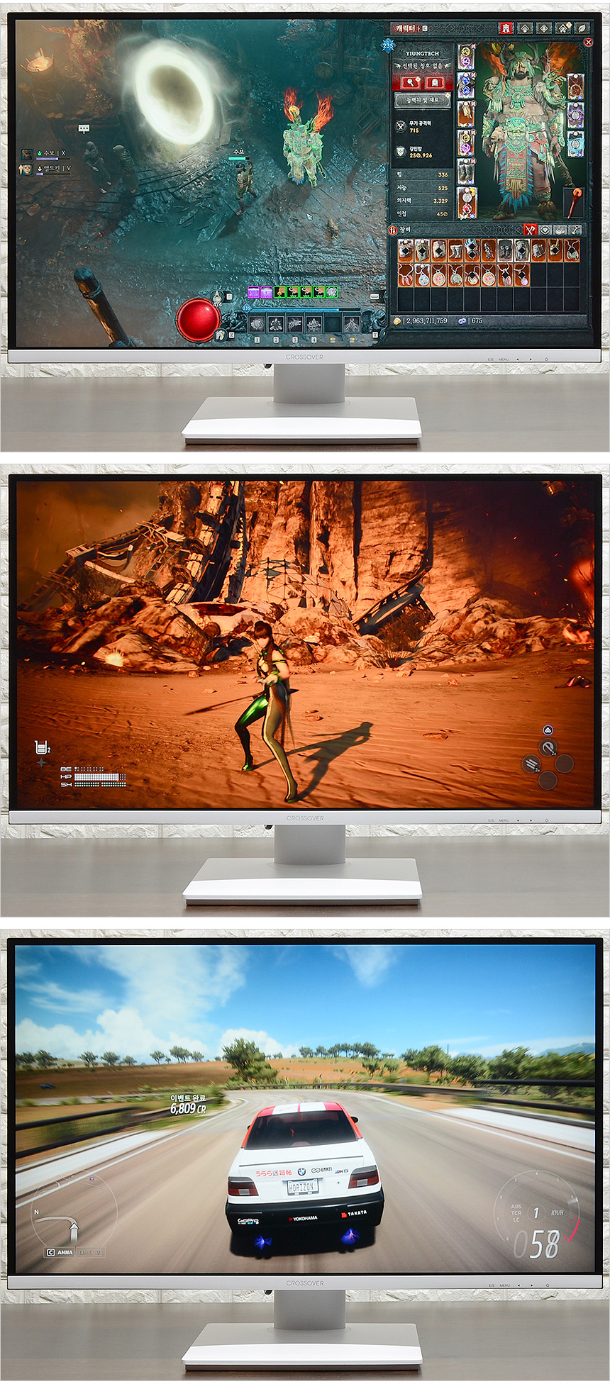 디아블로 4와 스텔라 블레이드, 포르자 호라이즌 5를 이용해 게임 테스트를 진행하고 있는 모습으로 빠른 응답속도를 지원하는 모델답게 잔상으로 인한 스트레스 없이 게임에 집중할 수 있었으며 프리싱크와 지싱크 어댑티브 지원으로 티밍 현상등도 발생하지 않았다.