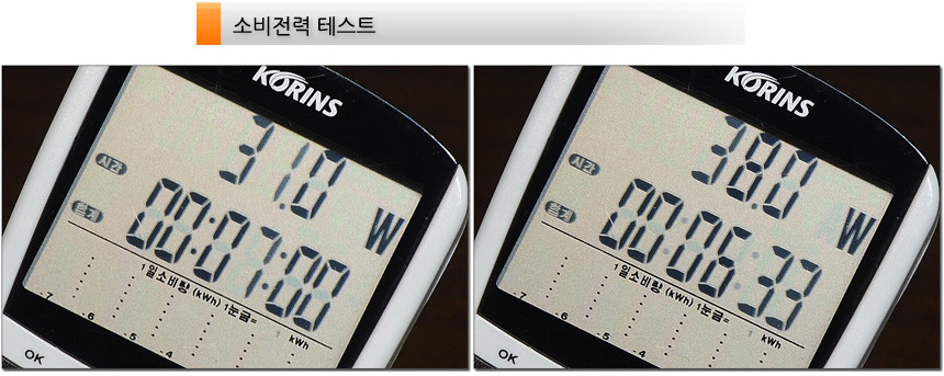 소비전력 테스트를 진행하고 있는 모습으로 대기모드에서는 0.5W, 50% 밝기에서 31W, 100% 밝기에서 38W 의 전력이 소비되는 것을 확인할 수 있었다.
