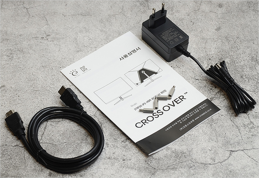 풀KIT 의 모습으로 모니터와 사용 설명서, 케이블 일체형 전원 어댑터가 제공되며 HDMI 케이블이 포함된 것을 확인할 수 있다.