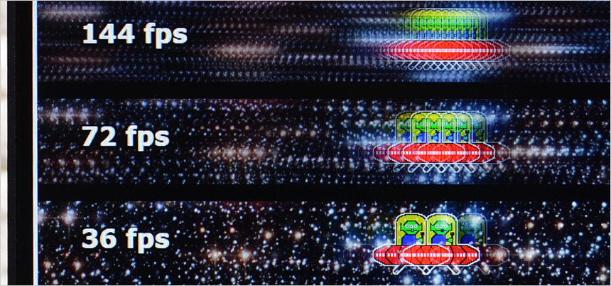 144Hz 주사율을 지원해 게이밍 모니터로 활용할 수 있다. 여기에 1ms 응답속도와 높은 밝기를 지원해 디아블로나 P의 거짓과 같이 어두운 배경이 주를 이루는 게임을 편하게 게임을 즐길 수 있다. 상단의 사진은 144Hz 의 높은 주사율을 쉽게 확인할 수 있도록 하위 프레임과 같이 재생되는 영상 (960 Pixel Per Sec) 을 셔터스피드 1/20 로 촬영한 모습으로 프레임이 낮을수록 캐릭터의 수가 적으며 프레임이 높아질수록 시간당 많은 화면이 뿌려지기 때문에 캐릭터의 수가 많은 것을 확인할 수 있다.