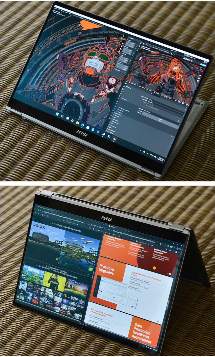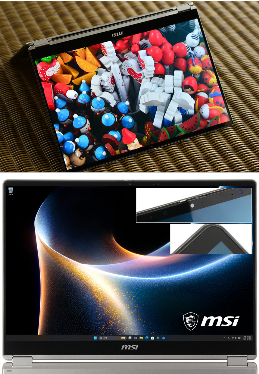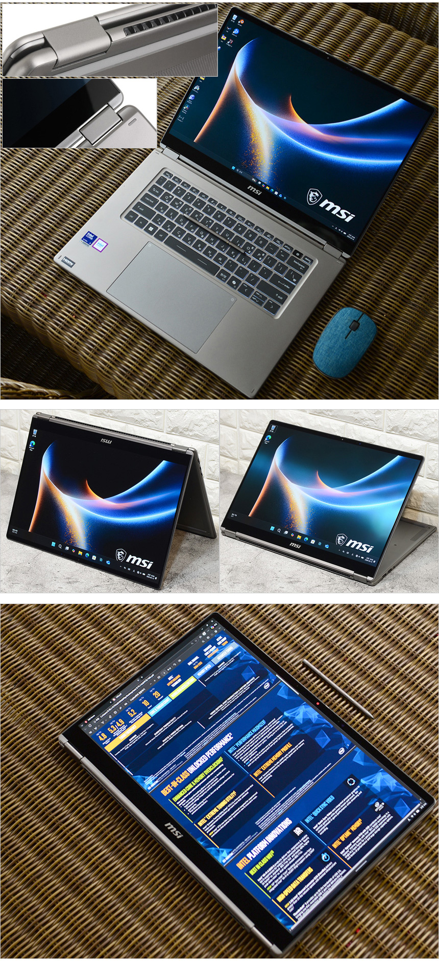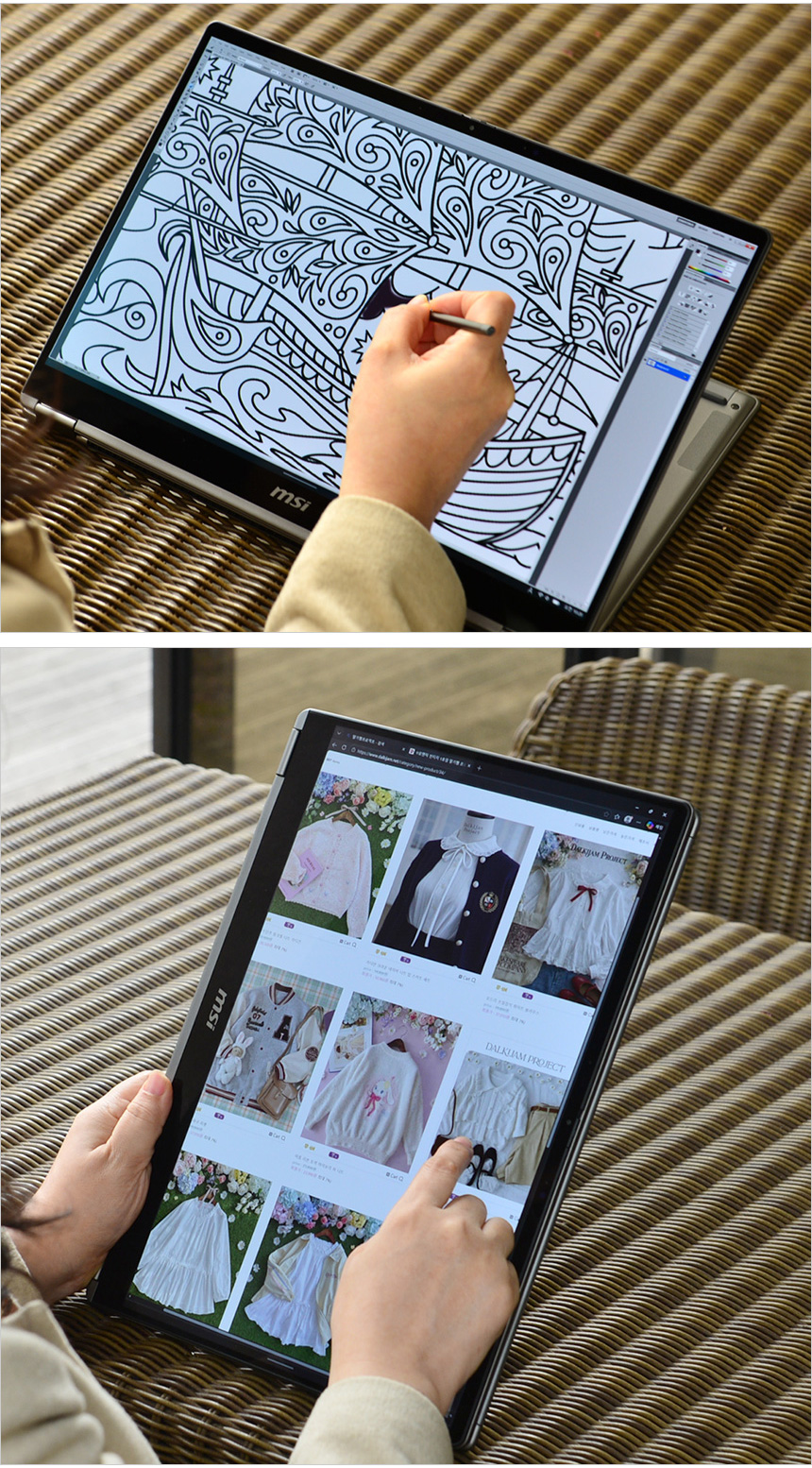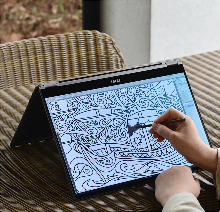 일반 노트북과 달리 360도 회전 터치스크린에 MSI 나노펜 지원으로 어떤 환경에서도 편하게 노트북을 사용할 수 있으며 2.8K 고해상도의 OLED 디스플레이를 탑재해 보급형 노트북에서는 느낄 수 없는 생생한 컬러를 보여준다. 뿐만 아니라 견고한 메탈섀시 적용과 더 가볍고 날렵해진 외관, 최대 24시간 사용이 가능한 긴 배터리 사용시간 지원으로 휴대성을 한층 높였으며 다양한 기능을 지원하는 액션 터치패드를 탑재해 편하게 노트북을 사용할 수 있다.