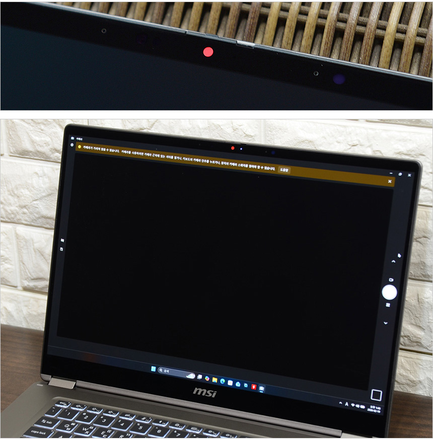 웹캠을 이용한 비주얼 해킹이나 사생활 침해를 원천적으로 차단할 수 있도록 카메라에 프라이버시 셔터가 장착된 것을 확인할 수 있다. 물리적으로 카메라를 가려주기 때문에 해킹으로 노트북 권한을 획득 하더라도 사용자나 주변 상황을 전혀 볼수 없다. (동영상을 통해 자세히 확인하기 바란다.)
