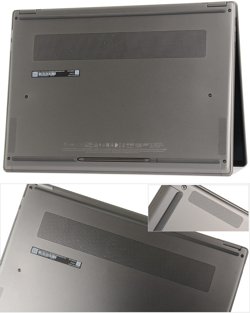 노트북 바닥면의 모습으로 칩셋이 설치된 상단에 통풍구가 설치된 것을 확인할 수 있으며 사방에 고무패드가 장착되어 미끄러짐을 방지한다. 또한 하단 양 측면에는 스피커 (2스피커+2우퍼) 가 설치되어 퀄리티 높은 사운드를 즐길 수 있다.