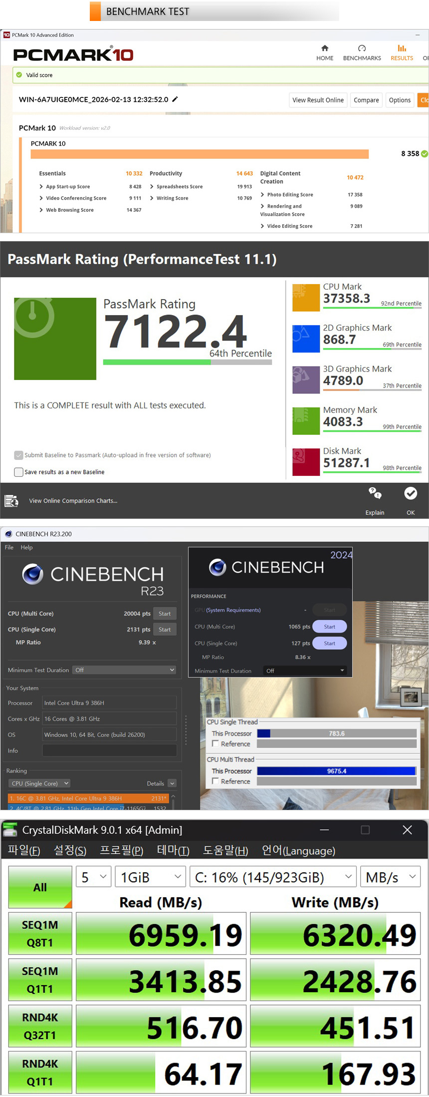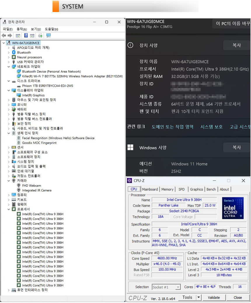 시스템 정보를 확인하고 있는 모습으로 4P+8E+4LP 코어에 24MB+18MB 캐시를 지원하는 인텔코어 울트라 9 386H 프로세서가 탑재된 것을 확인할 수 있다. 인텔 18A 공정으로 설계된 팬서레이크중 최상급 프로세서로 기존 모바일 프로세서나 하위 모델과 확연히 비교되는 강력한 성능을 경험할 수 있다.
