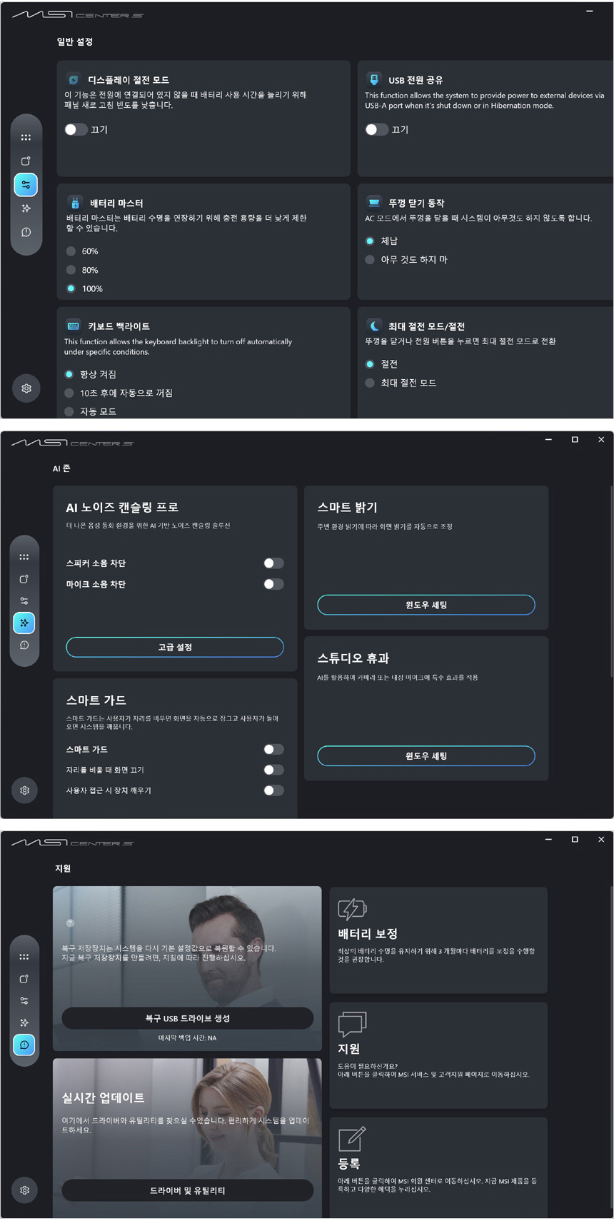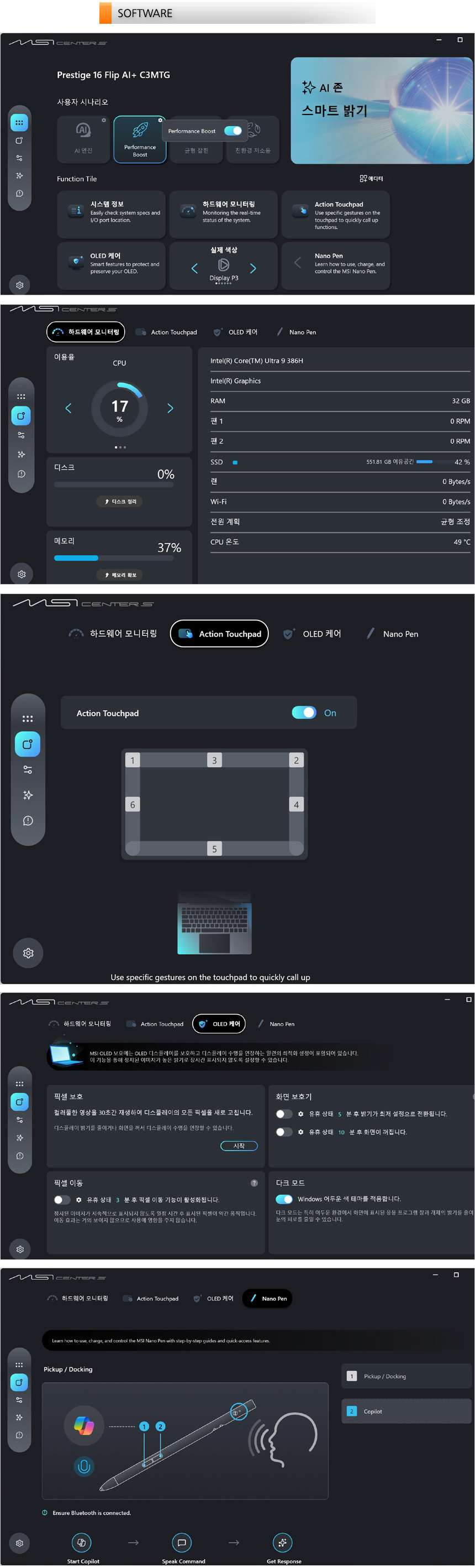 전용 S/W인 MSI 센터S 가 새로운 스타일로 변신한 것을 확인할 수 있다. 메인화면에서 퍼포먼스를 비롯한 중요설정을 조정할 수 있고 시스템 모니터링과 OLED 케어 설정이 가능하며 액션 터치패드와 전용 펜 설정도 지원한다.