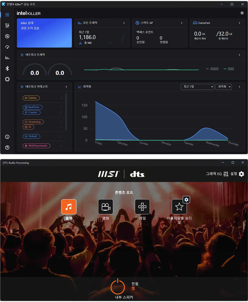 다양한 프로파일을 제공하는 DTS 오디오 지원으로 사용자에 맞는 사운드를 즐길 수 있으며 킬러 무선랜을 지원하는 모델답게 설정을 위한 전용 S/W를 제공한다.