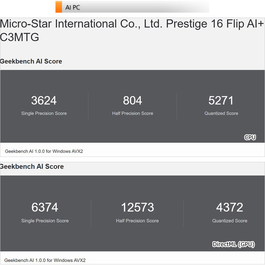 AI 전용 벤치마크 툴을 이용해 AI 성능 테스트를 진행하고 있는 모습으로 AI 에 특화된 CPU가 탑재된 모델답게 슬림 노트북과 확연한 스코어 차이를 보여주었다. (GPU 스코어가 상당히 높아진 것이 눈에 띈다.)