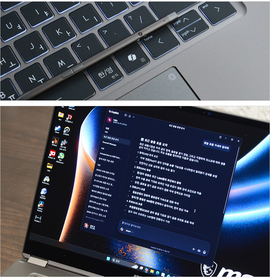 코파일럿 전용키를 지원해 편하게 AI를 활용할 수 있다. 상단의 사진은 코파일럿을 실행한 모습으로 궁금했던 부분을 쉽고 빠르게 알려주는 것을 확인할 수 있었다. 특히 이 제품은 나노펜에 마이크가 부착되어 코파일럿 실행과 음성 상호작용이 가능하다. (업무나 학습용으로 코파일럿을 유용하게 활용하고 있다. AI 가 어렵게 느껴진다면 우선 코파일럿부터 사용해 보기 바란다. 필자의 경우 많은 도움을 받고 있다.)