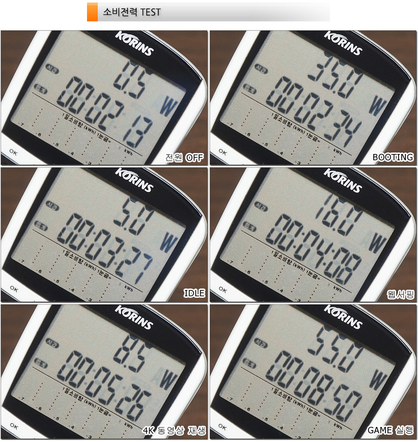 소비전력 테스트를 진행하고 있는 모습으로 (최고 성능 모드) 캐주얼한 작업에서는 5~20W 대의 소비전력으로 작동했으며 게임 실행시에는 55W 까지 소비전력이 올라가는 것을 확인할 수 있다. (CPU 사용율이 극히 높은 랜더링의 경우 50W대, 게임 실행시 40W 대에서 구동되었다.)