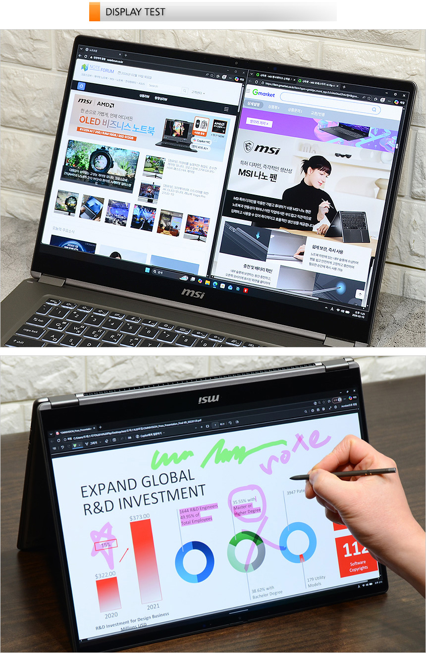 16형 대화면에 2.8K 해상도 지원으로 2개 이상의 웹페이지를 여유롭게 띄어두고 작업할 수 있었다. 듀얼모니터를 사용하기 힘든 외부에서도 다중창을 띄어두고 원활하게 작업을 할 수 있을 것이다. 또한 터치 테스트을 진행해 았는데 프리미엄 노트북 답게 보급형 투인원과는 확연히 비교되는 부드러움을 보여 주었으며 펜 사용 시 끊김 등도 발생하지 않았다. 또한 핑거 터치도 부드럽게 작동해 외부에서 편하게 노트북을 조작할 수 있었다. (멀티터치도 오작동 없이 정확하게 인식 되었다.)