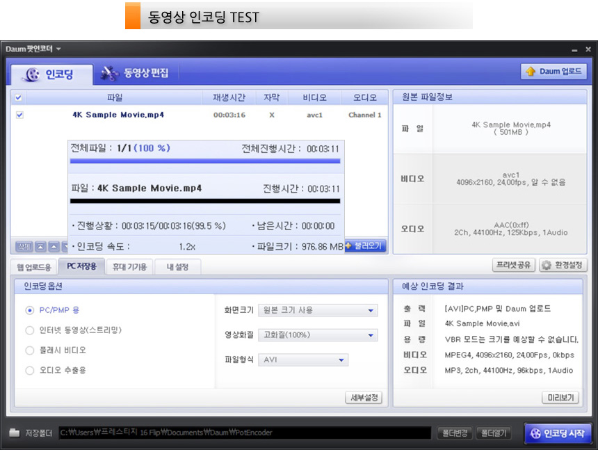 다음 팟인코더를 이용해 4K 동영상의 인코딩을 진행하고 있는 모습으로 최상급 프로세서가 탑재된 모델답게 3분 11초의 빠른 인코딩 시간을 보여주었다.