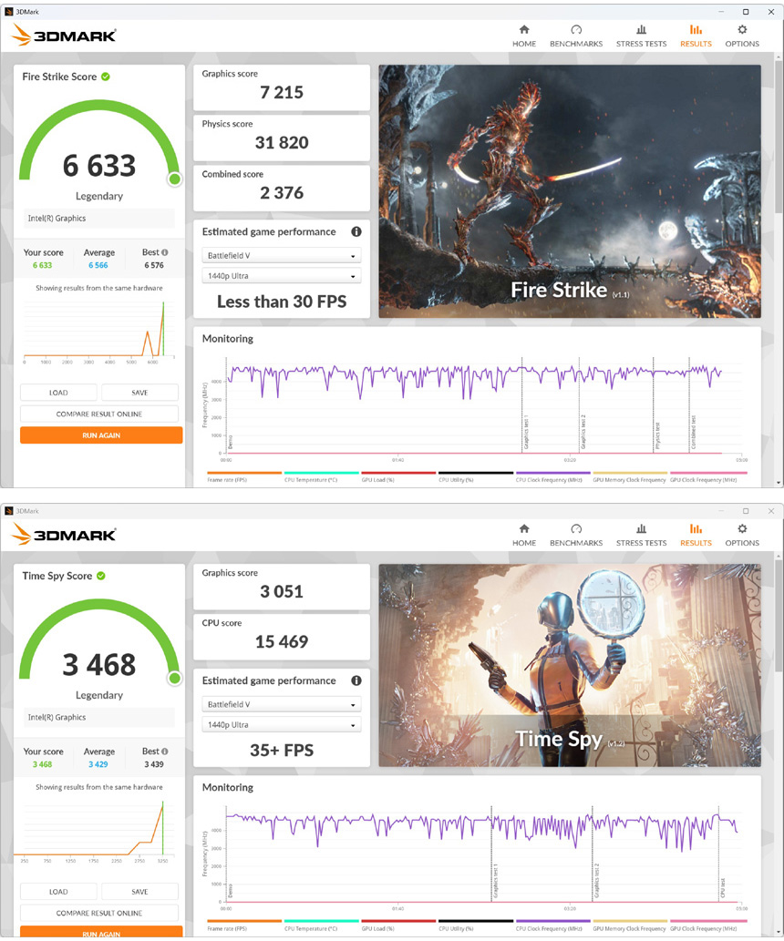 3DMARK를 이용해 외장그래픽의 성능을 확인하고 있는 모습으로 성능이 상당히 높아진 것을 확인할 수 있었다. 기존의 인텔 (R) 그래픽의 경우 LOL 정도를 실행할 수 있는 수준인데 반해 팬서레이크의 인텔 (R) 그래픽은 구형 아크 내장그래픽 수준으로 성능을 올라와 더 많은 게임을 편하게 즐길 수 있다.