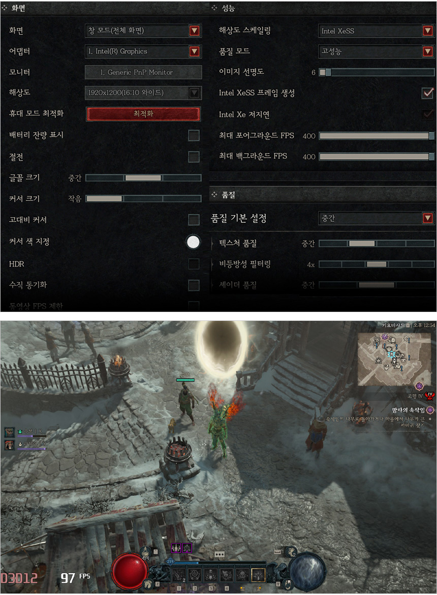 디아블로 4를 이용해 게임 테스트를 진행하고 있는 모습으로 WUXGA 해상도에서 100프레임 이상이 나오는 것을 확인할 수 있었다. (XeSS 프레임을 생성했을 때) 디아블로 4 플레이가 힘들었던 구형 모델들과 달리 여유롭게 게임을 즐길 수 있을 것이다.