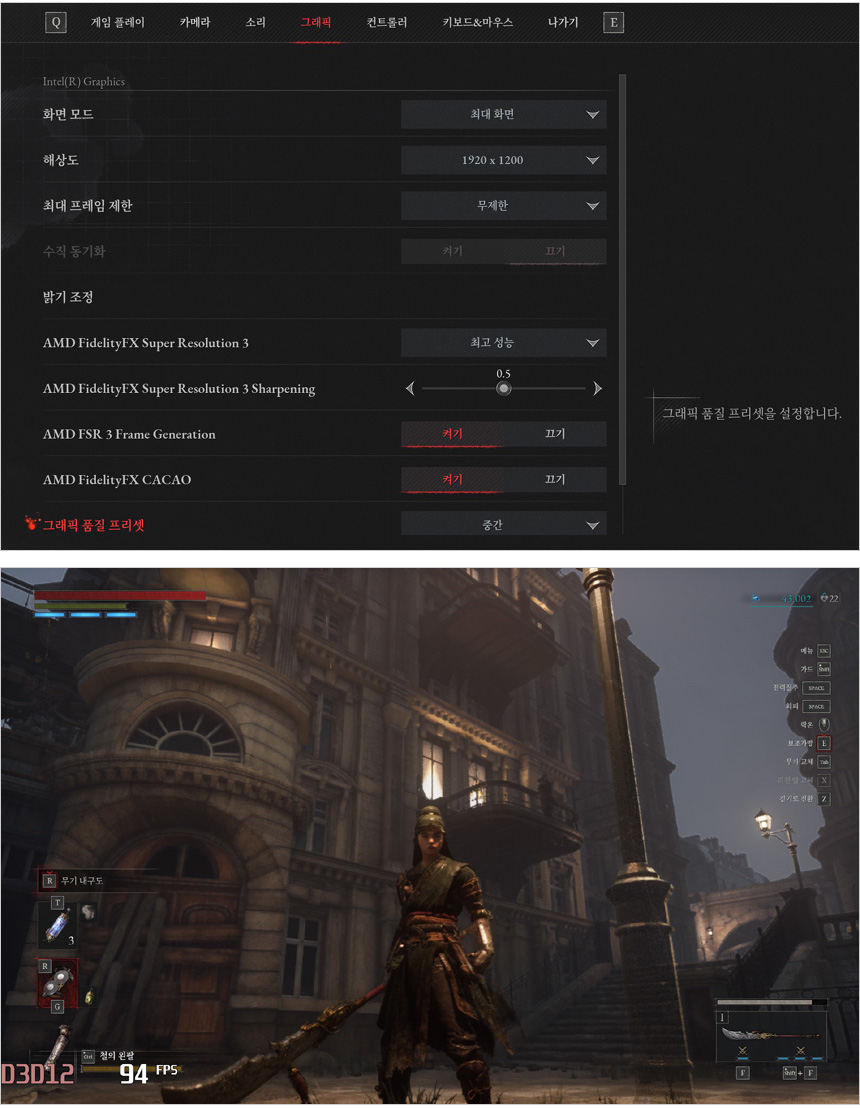 P의 거짓을 중간옵션에서 플레이 하고 있는 모습으로 FSR3 프레임 생성을 활성화 하면 FHD+ 기준 77-93 프레임을 보여주어 부드럽게 게임을 즐길 수 있었다. (동영상을 참조하기 바란다.)