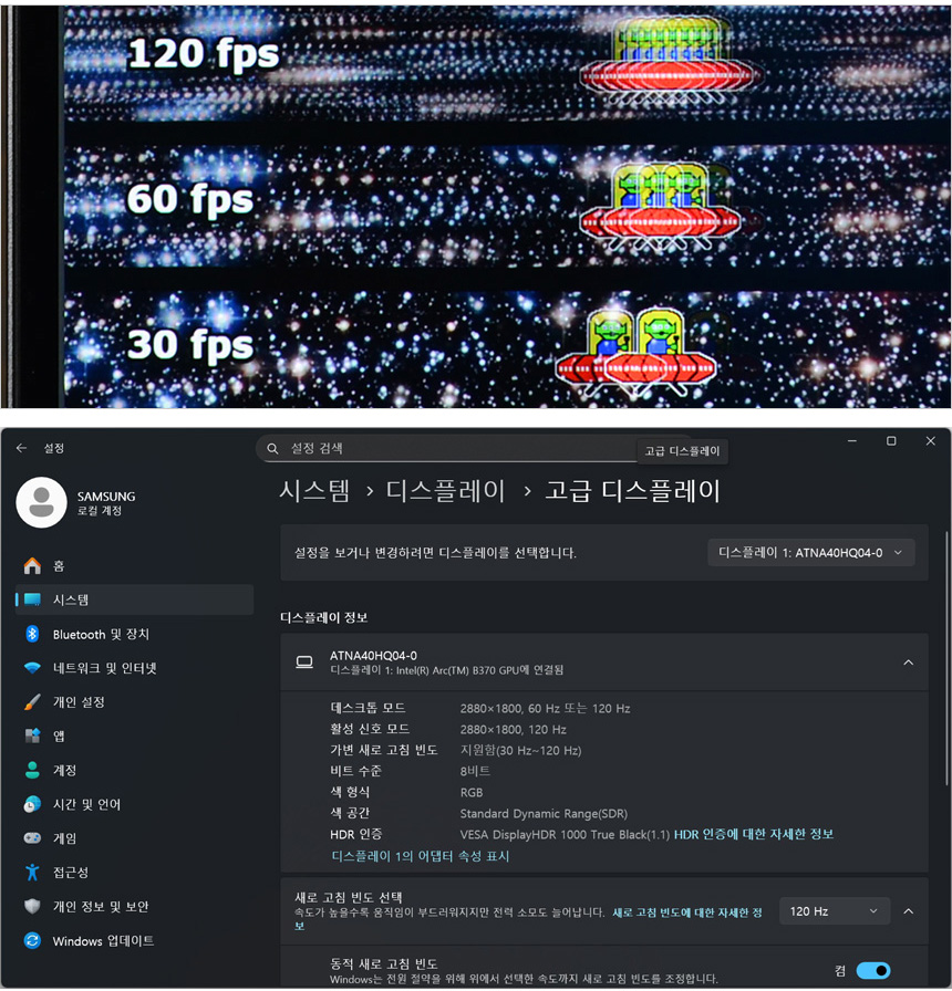 120Hz 주사율 지원으로 부드러운 영상을 즐길 수 있으며 영상에 맞게 주사율을 조정하는 가변주사율을 적용해 불필요한 배터리 소모를 최소화 했다. (가변 주사율이 30Hz 까지 낮아진 것이 눈에띈다. 정적인 화면에서 더 배터리를 절약하기 위한 셋팅이다.) 상단의 사진은 120Hz 주사율을 쉽게 인지할 수 있도록 하위 프레임과 같이 재생되는 영상 (960 Pixel Per Sec) 을 셔터스피드 1/20 로 촬영한 모습으로 프레임이 낮을수록 캐릭터의 수가 적으며 프레임이 높아질수록 시간당 많은 화면이 뿌려지기 때문에 캐릭터의 수가 많은 것을 확인할 수 있다.