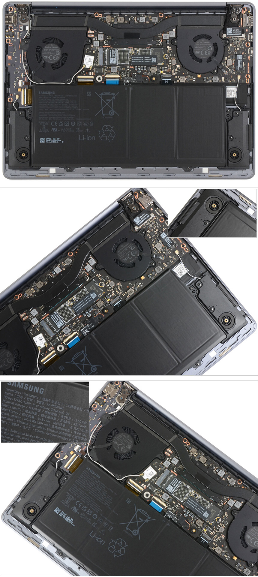 내부의 모습으로 듀얼팬이 설치된 것을 확인할 수 있다. (무게에 너무 집착하지 않고 듀얼팬 사용으로 안정성을 높인점이 인상적이다.) 또한 하단에는 67.18Wh (4306mAh) 리튬이온 배터리를 비롯해 스피커와 마그네틱 등이 부착된 것도 확인할 수 있다.