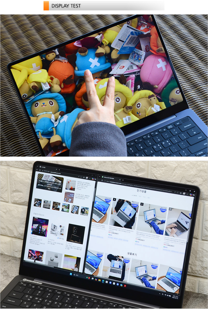 화면 크기는 작지만 WQXGA+ 고해상도를 지원하며 3면 슬림 베젤로 탁 트인 시야감을 제공해 2개 이상의 창을 띄어두고 사용할 수 있다. 또한 터치인식 테스트를 진행했는데 물 흐르듯 부드러운 터치감을 보여주어 편하게 노트북을 조작할 수 있었다.