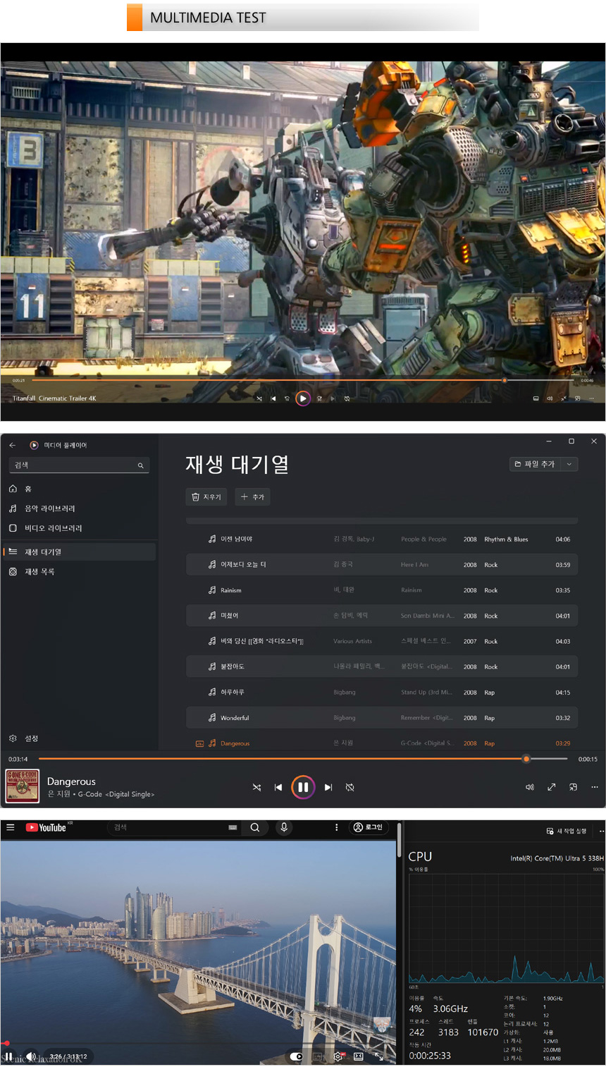 휴대성에 특화된 노트북은 성능이 떨어진다는 속설은 더 이상 성립하지 않는다는 것을 확인한 테스트였다. 인텔에서 새롭게 발표한 팬서레이크의 성능이 진일보해 구형 모델들을 압도하는 강력한 성능을 경험할 수 있게 되었다. 특히 인텔 아크 내장그래픽의 성능을 탄성을 자아낼 만큼 좋아진 것이 인상적이었다.
