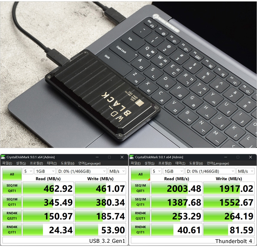 상단의 사진은 외장 SSD (USB 3.2 Gen2x2 지원제품) 를 이용해 테스트를 진행하고 있는 모습으로 썬더볼트 4 의 속도가 대단히 빠른 것을 확인할 수 있었다. 대용량 데이터 전송이 잦은 유저들이라면 만족하며 사용할 수 있을 것이다.