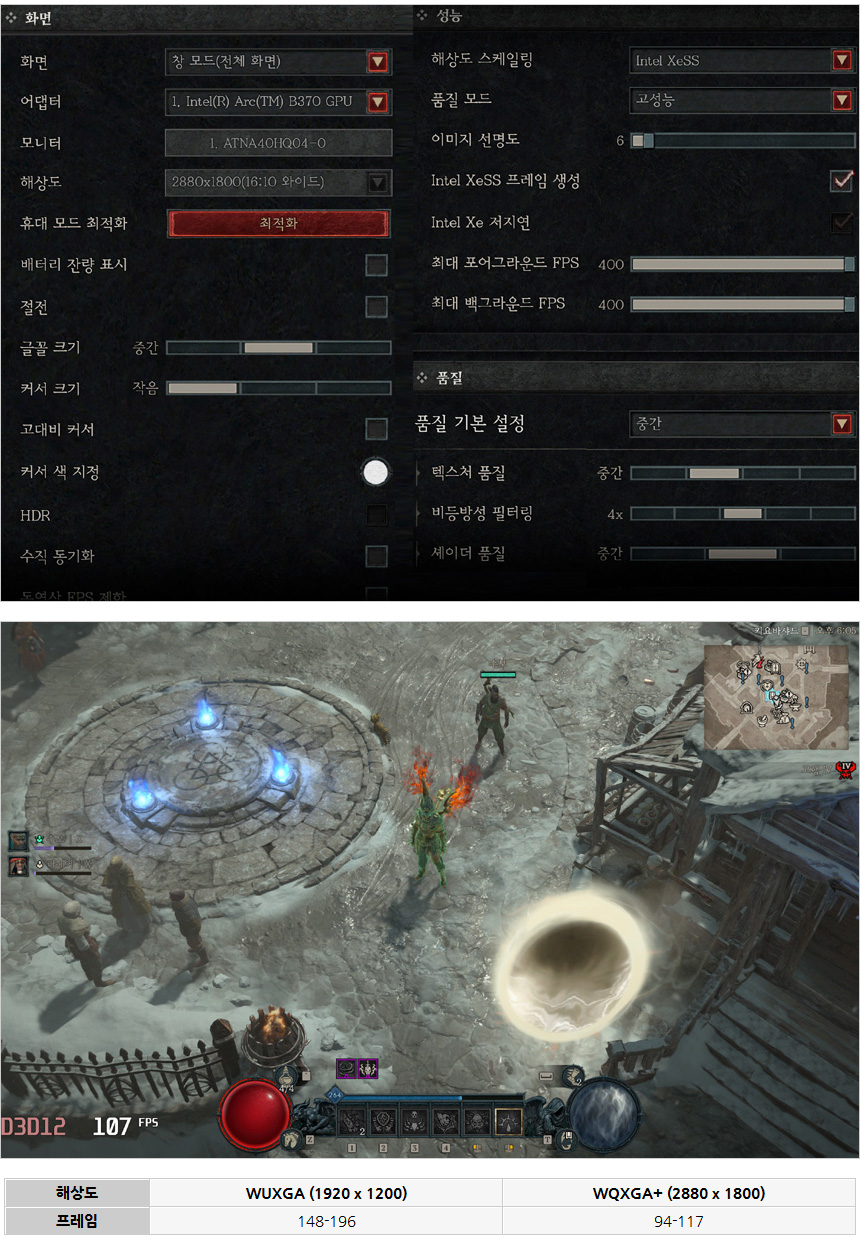 많은 유저들에게 사랑받고 있는 디아블로 4를 실행한 모습으로 XeSS 프레임 생성이 가능해 구형 게이밍 노트북 수준의 프레임으로 게임을 즐길 수 있었다. (기존의 슬림 노트북과는 비교되지 않을 정도로 스코어가 높아졌다.)
