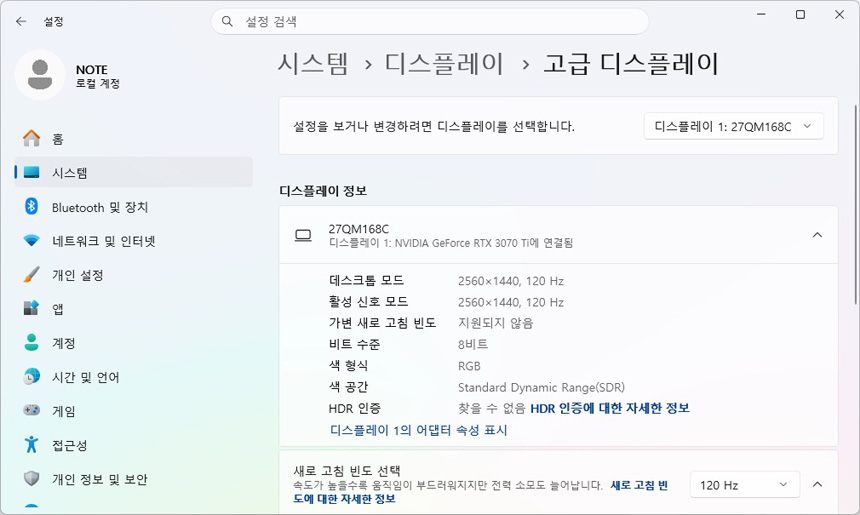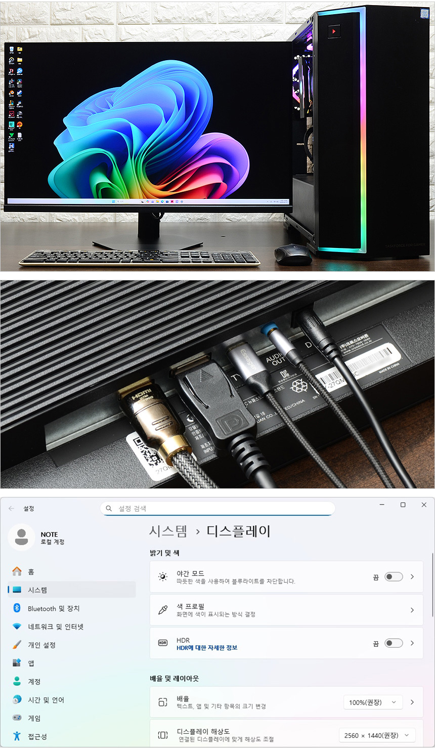모니터와 PC를 셋팅한 모습으로 27형 크기를 가진 모니터 답게 공간을 많이 차지하지 않았다. 집이나 사무실 등의 책상이 협소하더라도 사용에 큰 어려움은 없을 것이다. 또한 HDR 기술을 지원하는 모니터 답게 윈도우 에서도 HDR 설정이 가능한 것을 확인할 수 있다.