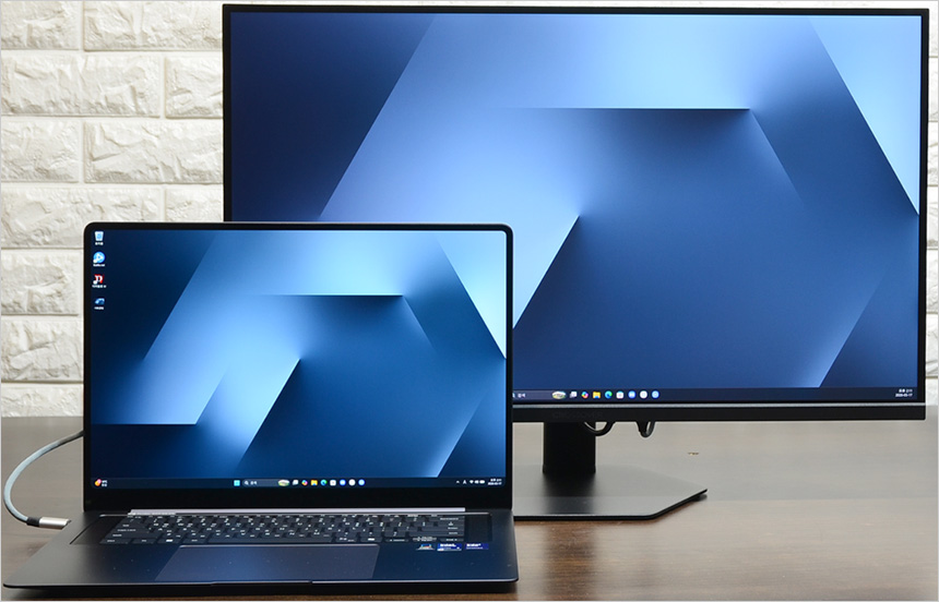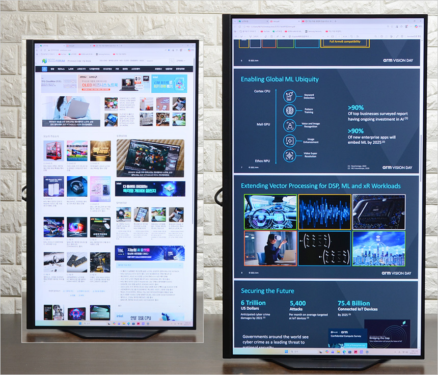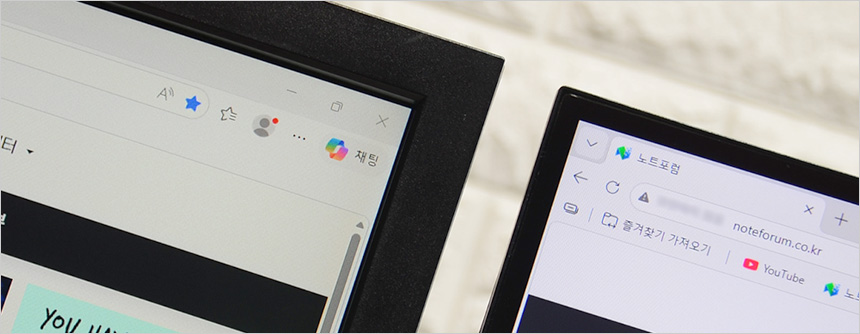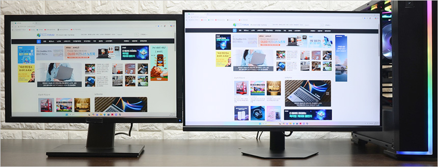 2대의 모니터를 설치한 김에 베젤 두께를 확인하고 있는 모습으로 확연한 차이를 보여주었다. 슬림 베젤이 적용된 모델로 높은 몰입감을 경험할 수 있을 것이다.