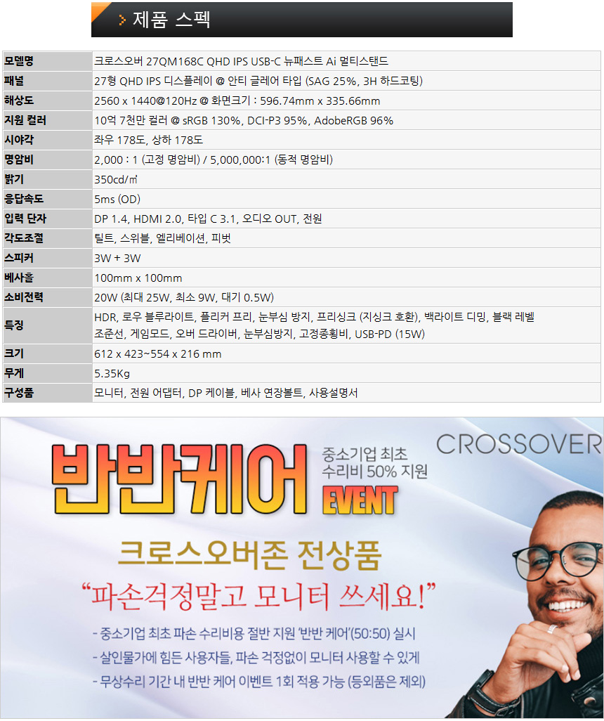 크로스오버 모니터는 5억원 생산물 배상 책임보험에 가입되어 있으며 중소기업 최초로 수리비 50%를 지원하는 반반케어 이벤트를 진행하고 있어 안심하고 사용할 수 있다. (무상수리 기간내 파손이 발생했을 때 수리비용의 절반을 지원한다.)